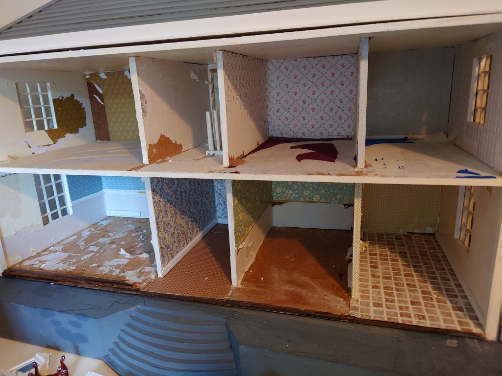 So, my “plan” is to completely gut the entire building – walls, floors, windows (and the door) and removing that staircase. The ladies at the The Kensington Dolls House Company are quite clear that staircases serve no real purpose in a dolls house as nobody ever had fun on the stairs (I paraphrase somewhat) and I quite agree! Out they came – that will create two extra rooms as a bonus!